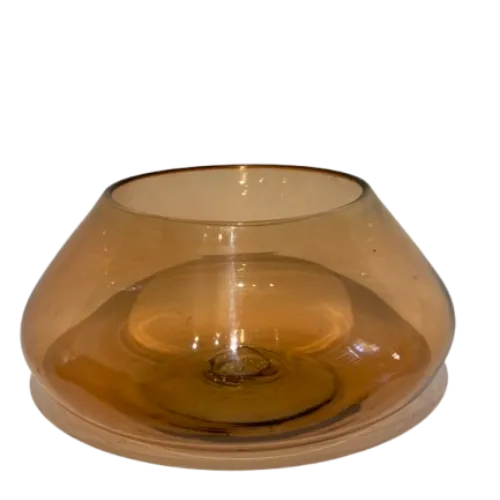 La transparencia del material permite apreciar cada matiz y ondulación propia del proceso artesanal, mientras que la superficie presenta un brillo sutil que captura la luz con naturalidad y acentúa sus formas orgánicas. Este juego de reflejos aporta profundidad y un carácter etéreo que hace que la pieza se perciba casi como un cuenco luminoso suspendido sobre la superficie donde se apoya.